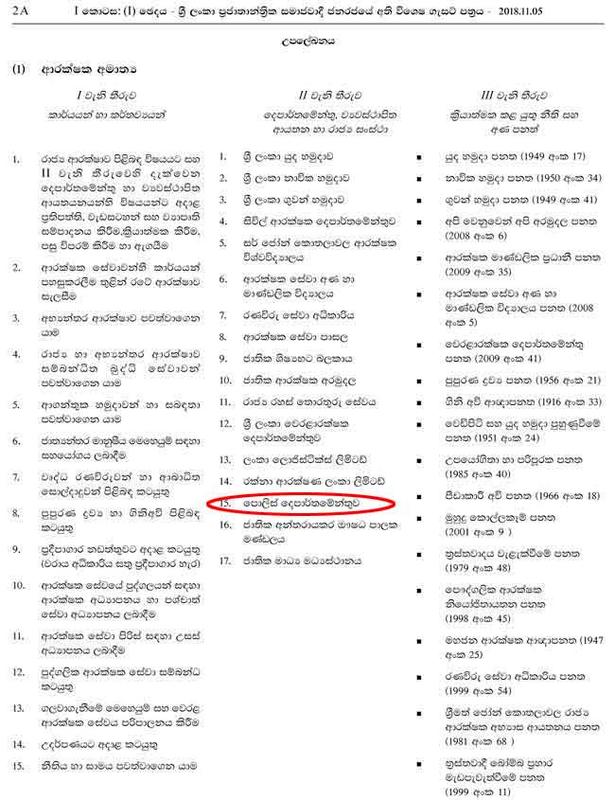 ඒ අනුව පොලිස් දෙපාර්තමේන්තුව ආරක්ෂක ආමාත්යාංශය යටතට ගෙන ඇත.